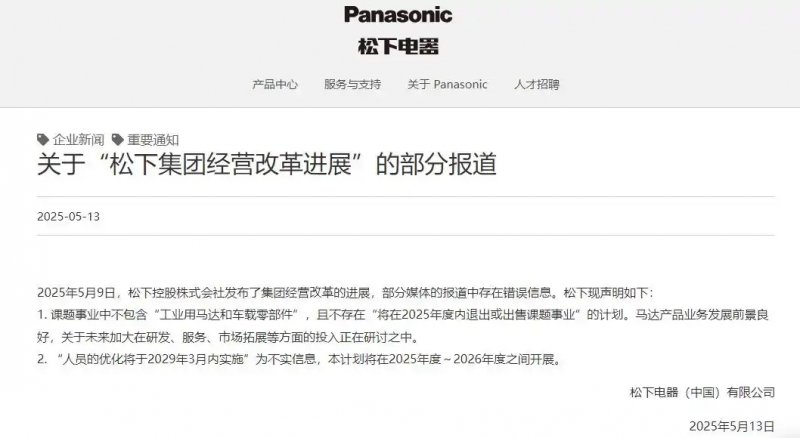 - 5月13日,松下電器在官網發布聲明稱,2025年5月9日,松下控股株式會社發布了集團經營改革的進展,部分媒體的報道中存在錯誤信息。松下現聲明如下: 1. 課題事業中不包含&