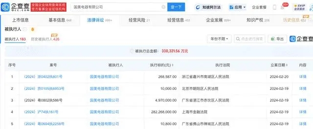 - 天眼查法律訴訟信息顯示,3月13日至3月15日,國美電器有限公司新增7條被執(zhí)行人信息,執(zhí)行標(biāo)的合計(jì)8865萬余元,部分案件被執(zhí)行人還包括上海樂全物業(yè)管理有限公司、北海國美