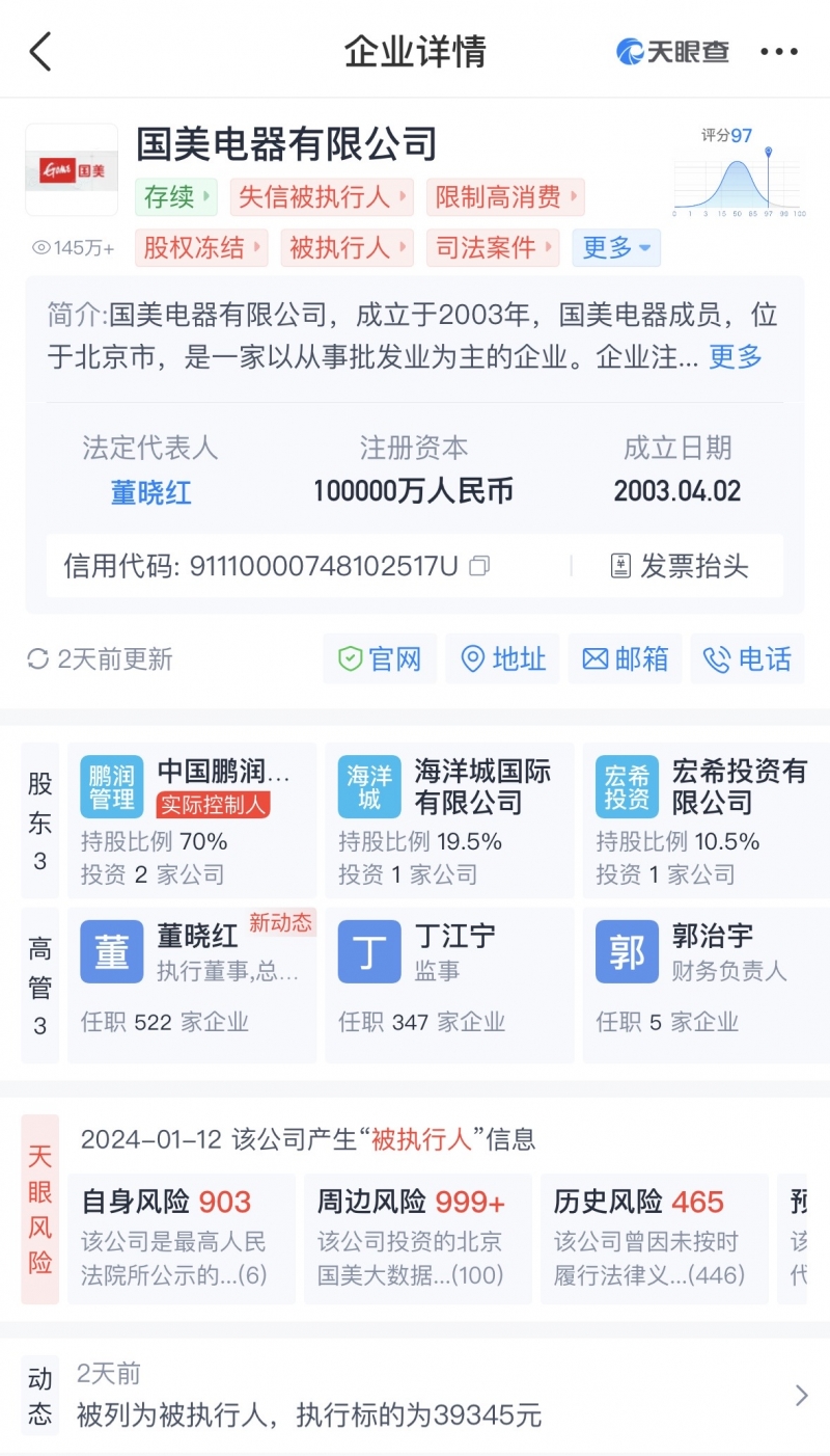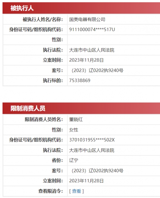 - 天眼查App顯示,11月28日,國(guó)美電器有限公司及旗下大連國(guó)美電器有限公司、國(guó)美電器零售有限公司新增一則被執(zhí)行人信息,執(zhí)行標(biāo)的7533萬(wàn)余元,涉及金融借款合同糾紛案件,執(zhí)行