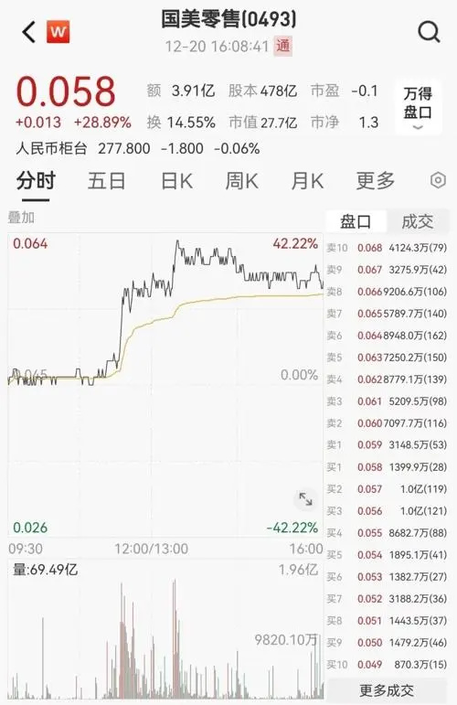 - 國(guó)美零售股價(jià)于上午11點(diǎn)左右突然飆升,最高漲幅達(dá)42.22%,最終收于0.058港元,漲28.89%。 東方甄選大跌超8% 12月20日,東方甄選股價(jià)大幅回落,最終收于29.10港元,跌幅