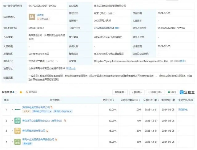 - 海信家電等成立創投管理公司 注冊資本2000萬