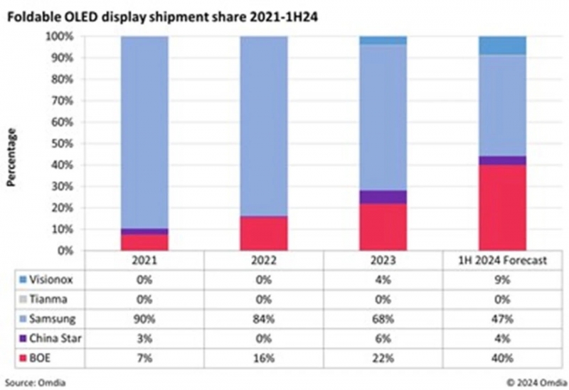- 京東方(000725.SZ,BOE)為榮耀6月13日晚發布的新手機供應柔性OLED折疊屏。調研機構Omdia預測,2024年上半年中國制造的柔性OLED折疊手機屏的出貨量將超過三星顯示折疊
