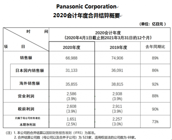 - 5月10日,松下電器發布2020年財年業績報告。截至2021年3月31日,松下電器在2020財年實現銷售額66988億日元,較去年同期74906億日元有所減少。國內及海外銷售額均有
