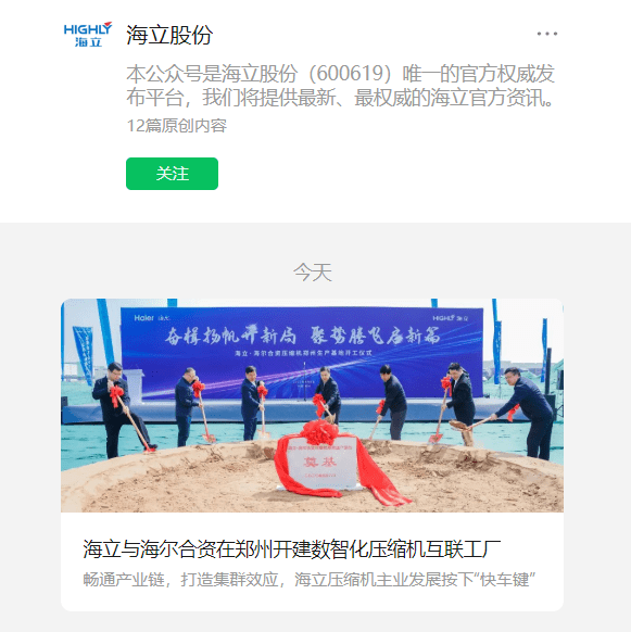 - 海立股份公眾號發文,上海海立(集團)股份有限公司(簡稱“海立股份”)與青島海爾空調器有限總公司(簡稱“海爾空調”)合資建設的鄭州空調壓縮機