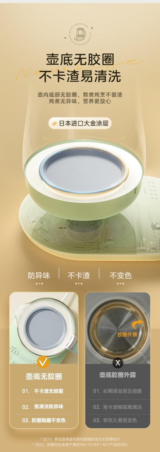 此外,養生壺壺底膠圈的清潔與養護也是困擾消費者的難題。普通養生壺的壺底膠圈大多都呈外露狀態,長期浸泡易生細菌,煮茶過久也容易發黃、結茶垢,煮小顆粒的食材還容易卡渣,難以清洗。針對這一難題,美的這款凈潤系列養生壺的壺底采用無膠圈設計,大大減少消費者清潔膠圈的煩惱,熬、煮、燉、烹都不易卡渣,燉煮也無異味,清洗起來更加方便,同時底盤突破傳統設計,凈潤防糊底盤一體化,不藏污納垢,使用后只需簡單沖洗擦拭,為“懶人”解決了清潔煩惱。