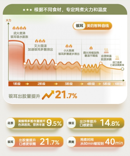 基于這一痛點,美的針對不同食材設計出智粹曲線,基于海量食材的實驗室測試,為不同養生食材定制燉煮火力和溫度,動態精準控制食材營養粹煮淅出。如針對銀耳燉煮的口感,對銀耳多糖溶出和出膠率進行了把控,用美的凈潤養生壺燉煮的銀耳出膠率提升21.7%,析膠濃稠,口感更軟糯。除了銀耳外,凈潤系列養生壺還針對綠豆、燕窩、花茶等食材制定營養燉煮程序,十大燉煮功能對應不同食材,為養生提供了一套舒適省心的“懶人”解決方案。