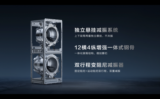 TCL研發(fā)團隊在雙子艙Q10中采用雙直驅(qū)變頻電機,并使用了雙行程變阻尼減振器;以建筑減震結構做參考,采用獨特的 12 橫 4 縱的整機一體式鋼骨結構,再通過仿真模態(tài)技術,最終成功做出擁有“行業(yè)最大上筒”的復式分區(qū)雙滾筒。