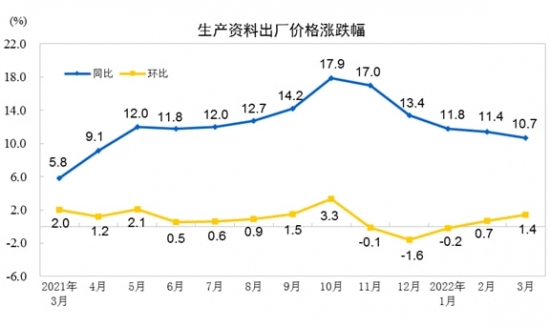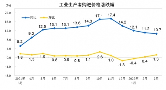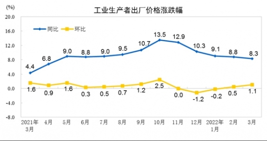2022年3月份,全國工業生產者出廠價格同比上漲8.3%,環比上漲1.1%;工業生產者購進價格同比上漲10.7%,環比上漲1.3%。一季度,工業生產者出廠價格比去年同期上漲8.7%,工業生產者購進價格上漲11.3%。