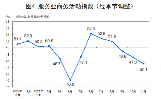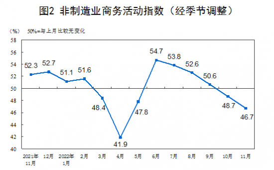 11月份,非制造業(yè)商務(wù)活動指數(shù)為46.7%,比上月下降2.0個百分點(diǎn),低于臨界點(diǎn),非制造業(yè)景氣水平有所回落。