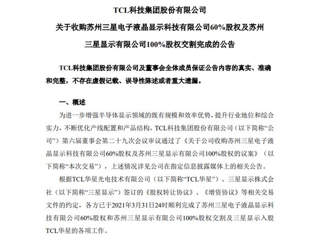 TCL科技:收購(gòu)蘇州三星電子液晶顯示科技有限公司60%股權(quán)交割完成