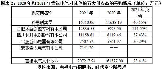 如圖表2所示,時(shí)代商學(xué)院對(duì)比了雪祺電氣對(duì)其他前五大供應(yīng)商的采購情況發(fā)現(xiàn),2021年,雪祺電氣對(duì)禾盛新材的采購增速遠(yuǎn)高于其他前五大供應(yīng)商,也高于雪祺電氣同期的營收增速。