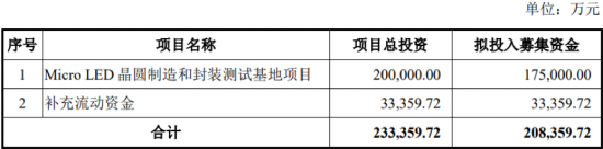 據悉,此次募資的20.8億元,其中17.5億元投向Micro LED晶圓制造和封裝測試基地項目,預計建設周期為4年,年產Micro LED晶圓5.88萬片組、Micro LED像素器件45000.00kk顆,產品主要面向大尺寸商用顯示、AR/VR頭戴式設備及可穿戴設備等應用。