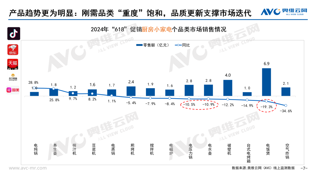 傳統零售平臺、直播電商、甚至包含新冠疫情促使的“宅經濟”都在一定程度上快速透支了品類的市場普及速度。那么在“宅經濟”爆發之后的廚房小家電恢復期內,電飯煲品類一直是廚房小家電全品類中最抗壓的品類,每年保持小幅度整體市場規模的變化,那么在今年2024年“618”電飯煲品類的下滑也成為情理之中,與此同時也預示著整個主流抗壓品類的重度飽和后期下滑危機的到來。此外,從本次“618”品類市場表現當中我們不難發現,低成本養生小家電更受消費者的歡迎,例如電燉鍋、養生壺、榨汁機等。低成本小家電均價養生健康“平替”需求展現。