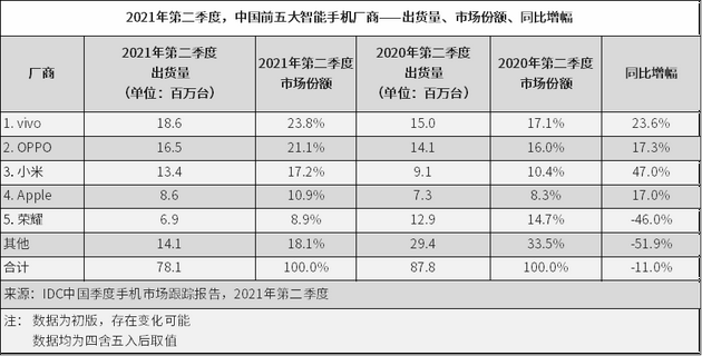 根據(jù)調(diào)研機(jī)構(gòu)IDC發(fā)布的2021年第二季度國內(nèi)市場手機(jī)出貨量報(bào)告顯示,前五名分別為vivo、OPPO、小米、蘋果和榮耀,而曾經(jīng)的國內(nèi)霸主華為已經(jīng)跌出前五。