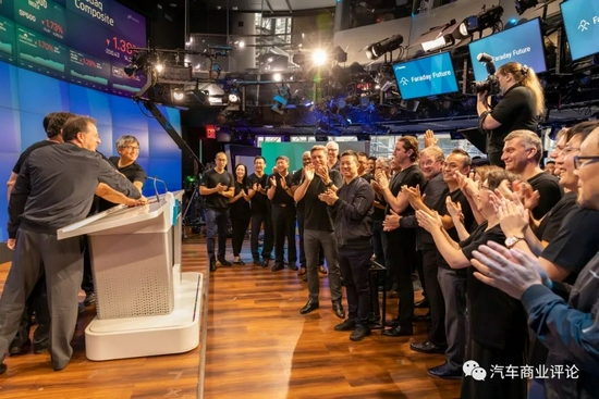 FF上市當天,六位來自不同領域的FF外部合伙人作為“Futurist Alliance” 的代表上臺為掛牌儀式敲鐘,賈躍亭站在臺下鼓掌。