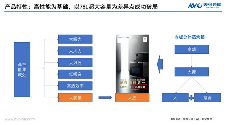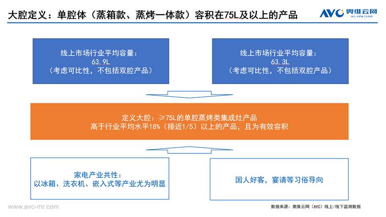 由于集成灶整體尺寸較為固定,因此在有限的空間下提升蒸烤箱的容量十分不易,每增加一升容量,都需要反復研究,以突破技術的掣肘。根據奧維云網(AVC)監測數據顯示,單腔蒸烤類集成灶線上市場平均容積為63.9L,線下市場平均容積為63.3L,本次定義“大腔”為有效容積75L及以上單一腔體產品,容積超行業平均水平18%以上。因此,大腔蒸烤集成灶是指單腔容積在75L及以上的蒸烤類集成灶。