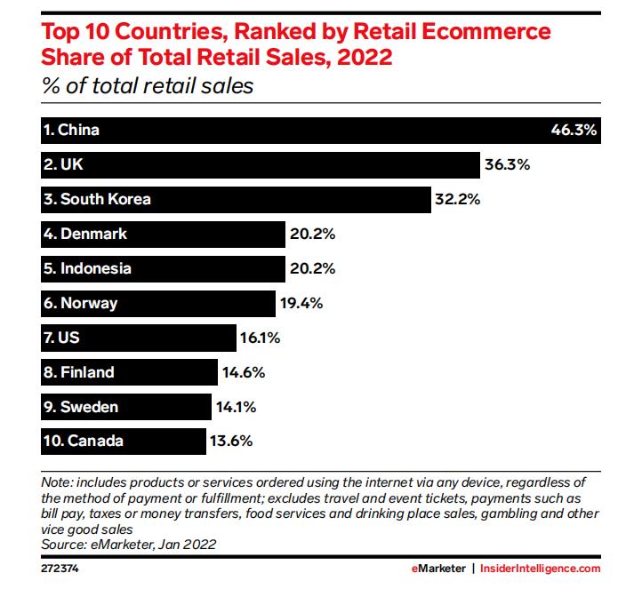 目前,韓國市場電商滲透率(電商銷售額占零售總額百分比)非常高。據eMarketer公布的數據,2022年1月,全球電商滲透率前十的國家,中國、英國和韓國牢牢占據前三位。中國達到了46.3%,而韓國也達到了32.2%,還有非常不錯的增長潛力。