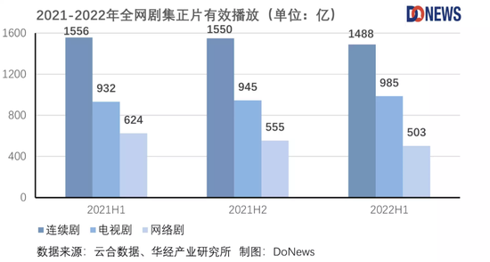 根據云合數據,2022H1全網劇集正片有效播放累計1488億,同比下降4%;其中電視劇有效播放為985億,同比小幅增長6%;網絡劇有效播放為503億,同比下降19%。