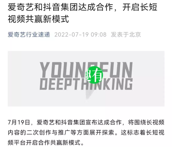 7月19日,愛奇藝宣布與抖音達成合作,圍繞長視頻內容的二次創作與推廣等方面展開探索。長短視頻兩大領先平臺的合作,終于為雙方陣營長久以來的拉鋸給出了正面信號。