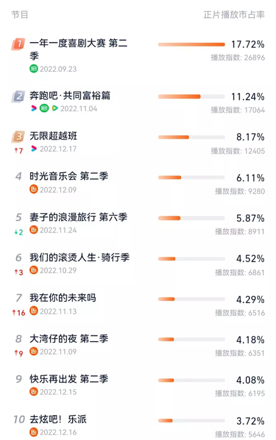 同期的綜藝節目來看,芒果TV依然拿手,占據8款節目,但前三名屬于愛優騰。由浙江衛視、優酷、TVB共同出品的演員專業藝訓勵志真人秀《無限超越班》集結了成龍、爾冬升、惠英紅、佘詩曼等一眾知名藝人,自12月10日播出先導片以來備受關注,預計后續將會在播放市占率中更進一步。
