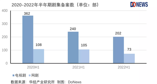 據華經產業研究院統計,2020-2022年上半年劇集備案數逐年下滑。今年上半年,電視劇(全國拍攝制作電視劇備案)新增備案較去年同期下降15.8%,網劇(重點網絡影視劇上線登記備案)新增備案同比下降30.5%。