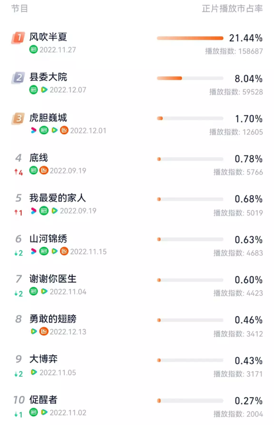 以燈塔數據上周(12.12-12.18)的周榜來看,正片播放市占率前十名中,愛奇藝和騰訊分別占了8個,優酷占3個,芒果TV占4個。
