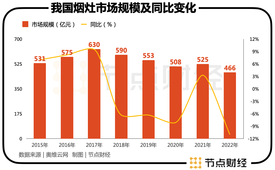 奧維云網(wǎng)數(shù)據(jù)顯示,2022年國內(nèi)煙灶品類(油煙機(jī)與燃?xì)庠?零售額為466億元,同比下滑11%,也是自2015年之后規(guī)模首次跌倒500億元以內(nèi)。