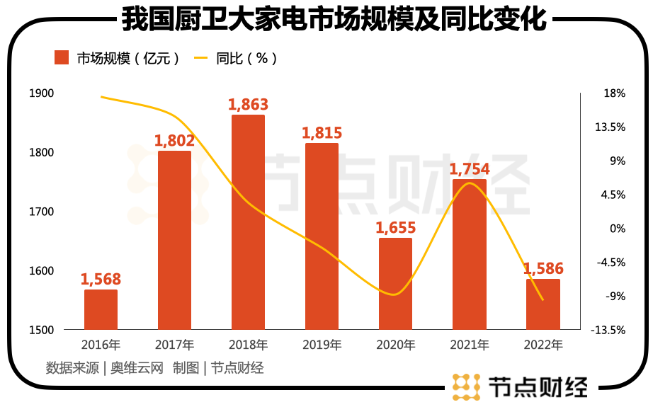 數(shù)據(jù)顯示,我國廚衛(wèi)大家電市場規(guī)模在2018年達(dá)到1863億元見頂后,此后的四年中有三年處在負(fù)增長狀態(tài),2022年市場規(guī)模為1586億元,回到了2016年的水平。