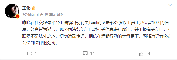 對于上述傳言,5月14日午間,小米集團公關部總經理王化通過微博回應此事。他說到,昨晚在社交媒體平臺上陸續出現有關我司武漢總部 35歲以上員工只保留10%的信息,經查皆為謠言。現公司法務部門已對相關信息進行取證,并上報有關部門。