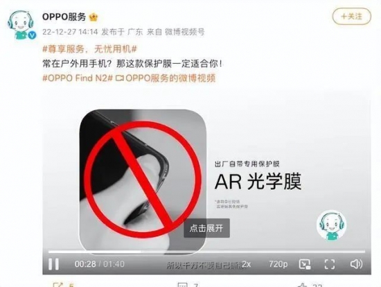2022年OPPO推出Find N2折疊屏手機發(fā)布不久之后,官方就已經通過官方微博科普了自帶貼膜的重要性,提醒用戶不要自行撕掉。至于原因除了用戶自己撕容易損壞屏幕外,還因為自帶的貼膜在保護屏幕這一基本作用外,還有對屏幕顯示方面的加分。