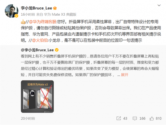 不過,隨后華為終端客服微博在轉評該文時表示:折疊屏手機采用柔性屏幕,出廠自帶特殊設計的專用保護膜,請勿自行撕除或粘貼其他保護膜,否則會導致屏幕出保。我們在產品使用指南、華為官網、產品包裝盒內溫馨提示卡和手機初次開機等界面都有相關提示說明。