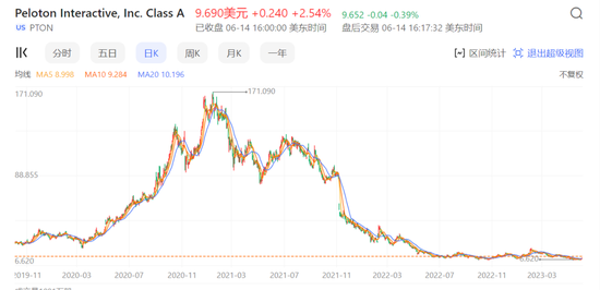 與Keep同樣享受到疫情帶來紅利的,還有Keep的對標公司,美國健身平臺“Peloton”,Peloton的收入結構也與Keep高度類似。從Peloton的股價表現不難看出,2020年期間,Peloton股價一路高漲,市值更是一度接近500億美元。