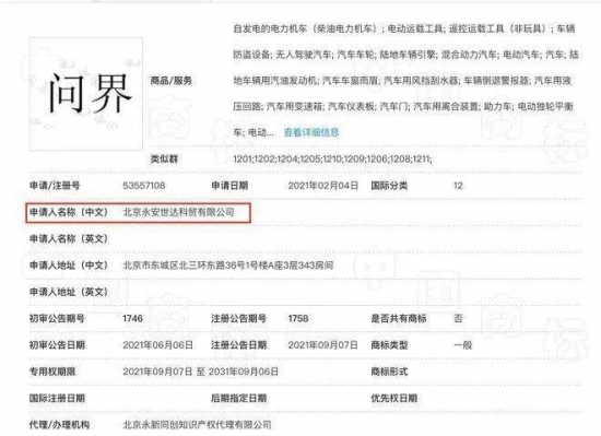 問界雖然是由華為和賽力斯共同推出的汽車品牌,但問界此前的商標所有者既不是華為,也不是賽力斯,而是一家第三方公司——北京永安世達科貿有限公司,而且這個第三方似乎并沒有和華為、賽力斯有所關聯。