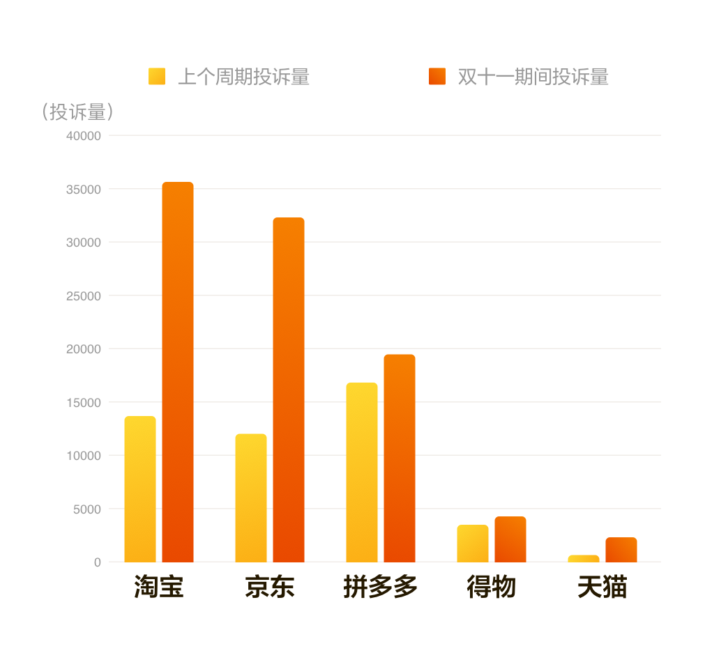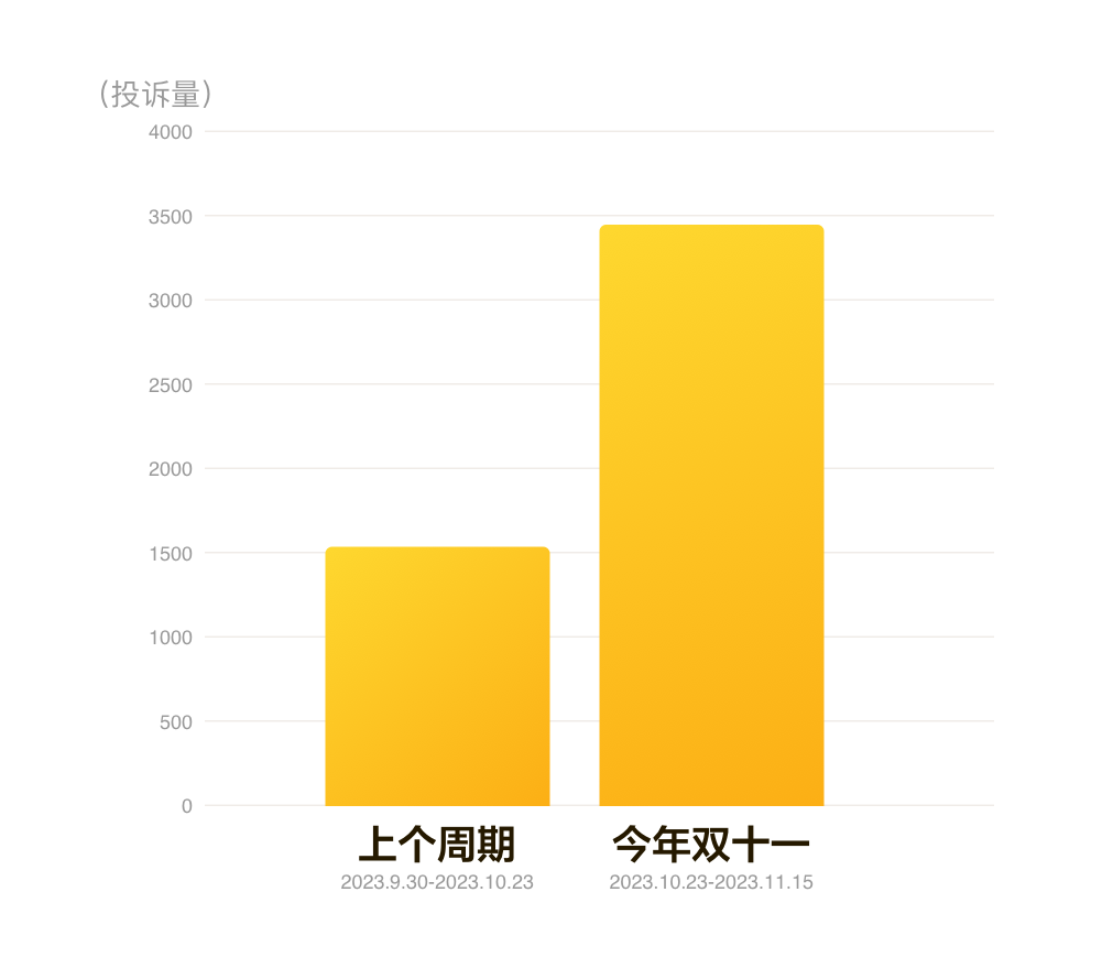 2023年“雙十一”期間, 淘寶、京東投訴量均超3萬單,投訴量環比漲幅均超過150%,天貓有效投訴量環比漲幅最大,上漲超過250%。