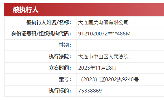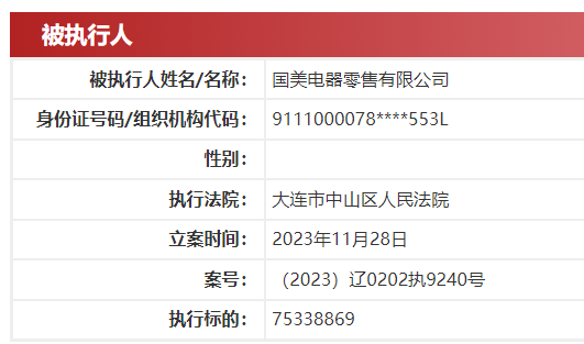 【劃重點】: 據中國執行信息公開網消息,國美電器有限公司(下稱:國美電器)、大連國美電器有限公司及國美電器零售有限公司11月28日新增一則被執行人信息,執行標的7533.89萬。 圖源:中國執行信息公開