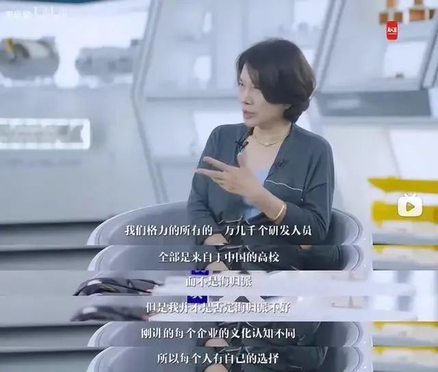 早在 2021年5月30日,董明珠就曾在全國青年企業(yè)家峰會(huì)上強(qiáng)調(diào)過,格力不會(huì)采用海歸派研發(fā)人員。在《南風(fēng)窗》的采訪中,董明珠對此給出的解釋是:“不是否定海歸派,是一種企業(yè)的文化認(rèn)知,每個(gè)人有自己的選擇。”