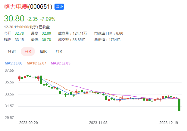 此消息一出,12月20日開盤,格力電器股價(jià)暴跌7.09%,一天市值蒸發(fā)超130億。