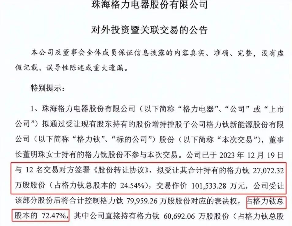 12月19日晚間,格力電器在公告里宣布,擬通過受讓12名交易對方合計(jì)持有的格力鈦新能源股份有限公司(下稱“格力鈦”)約2.71億股股份(占格力鈦總股本的24.54%)的方式增持格力鈦,交易作價(jià)約10.15億元。交易后,格力電器在格力鈦的持股比例將會(huì)增至55.01%。加上董明珠個(gè)人持有的17.46%股份的表決權(quán) ,格力電器在格力鈦的表決權(quán)將增至72.47%。