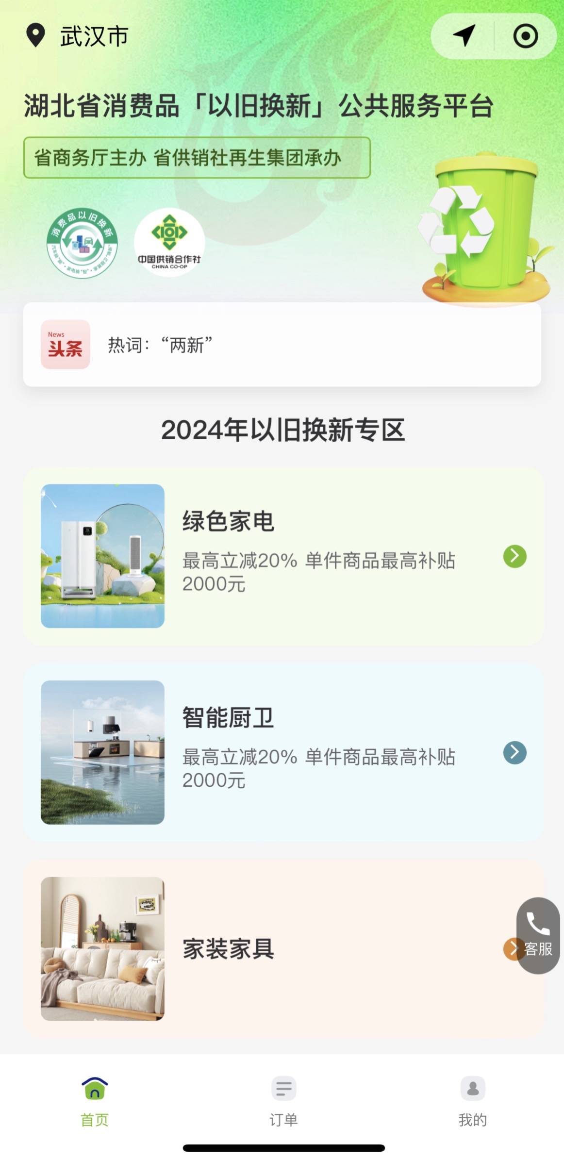 省內個人消費者登錄“湖北供銷回收”微信小程序,進入“2024以舊換新專區”綠色家電欄目,選擇“先購新再守舊”或“先收舊再購新”補貼方式;