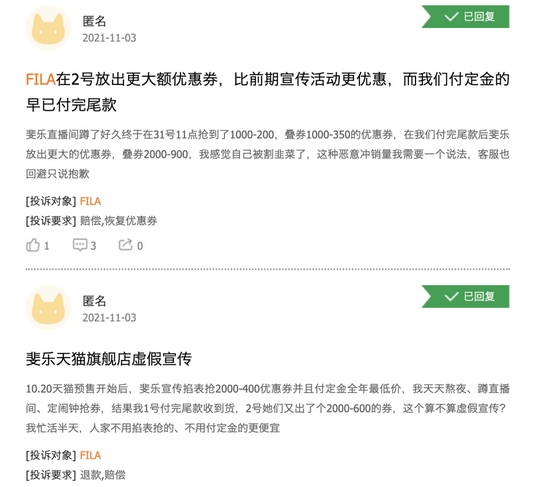 不過,據消費者反映,目前電商平臺還普遍存在一些老生常談的問題。比如“價格迷霧”,此次雙11期間,斐樂、匡威等品牌還引發消費者集體投訴,不少消費者在黑貓投訴平臺反映,付完定金發現,參加預售比現賣更貴。