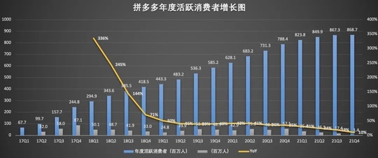 月活用戶增速放緩的同時,拼多多平臺的年度活躍消費者增速同樣呈現放緩趨勢。
